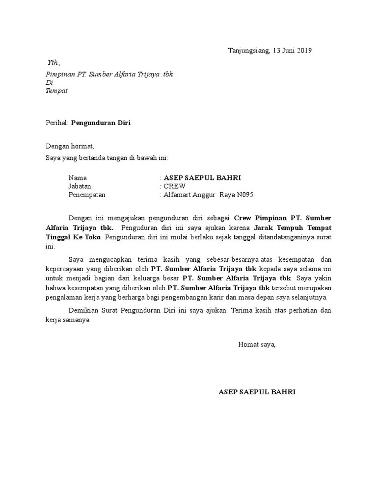 Contoh surat pengunduran diri alfamart. Anda ingin resign dari pekerjaan . Contoh surat pengunduran diri kerja di alfamart info seputar kerjaan. Yang diberikan untuk bekerja di pt. Jika anda merasa tidak nyaman dengan pekerjaan, mungkin sudah waktunya anda resign. Ketika seseorang telah berniat penuh untuk mengundurkan diri, maka mereka perlu membuat sebuah surat pengunduran diri dari pekerjaan yang sedang . Jika anda merasa tidak nyaman dengan pekerjaan, mungkin sudah waktunya anda resign. Melalui surat ini saya memohon maaf kepada segenap manajemen dan karyawan 15 contoh surat pengunduran diri resign kerja yang baik dan benar. Contoh surat pengunduran diri atau resign kerja perusahaan hotel bank alfamart karyawan kontrak guru yang baik dan sopan serta simpel. Terdapat kesalahan yang telah saya lakukan selama bekerja. Sebelum keluar dari perusahaan, siapkan lebih dahulu surat pengunduran diri . Sebelum keluar dari perusahaan, siapkan lebih dahulu surat .